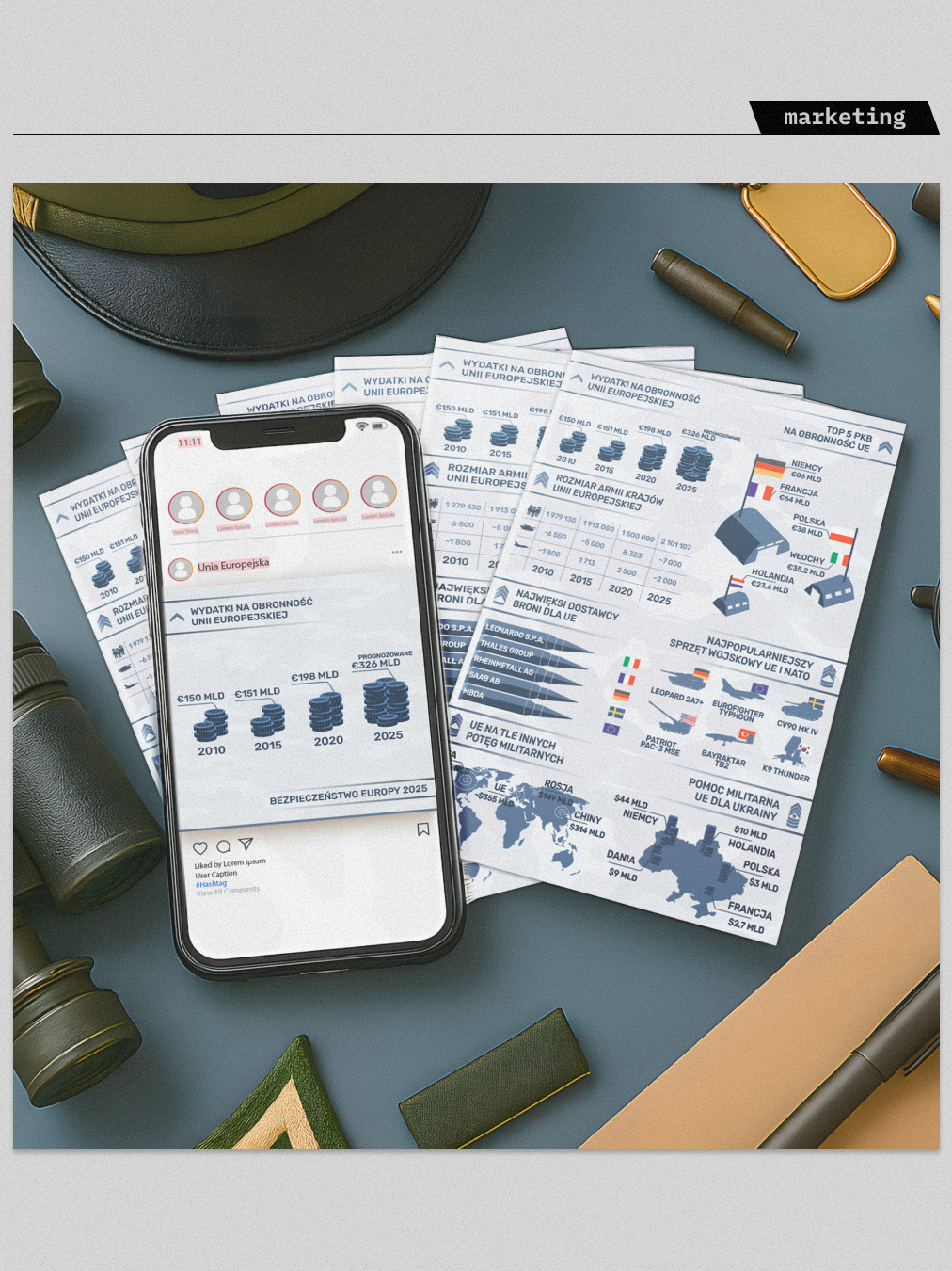 Broszura informacyjna i posty do portali social media na temat obronności Unii Europejskiej.